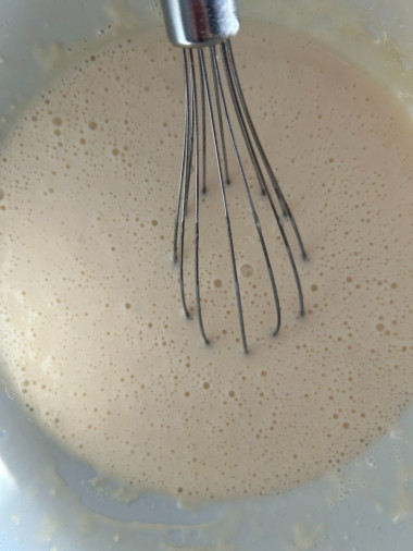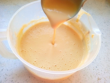 Добавьте растительное масло и тщательно перемешайте, чтобы масло полностью разошлось по тесту. Оставьте тесто на 10-15 минут, чтобы оно остыло. Готовое тесто должно быть не густым и не жидким. Оно будет легко стекать с половника.