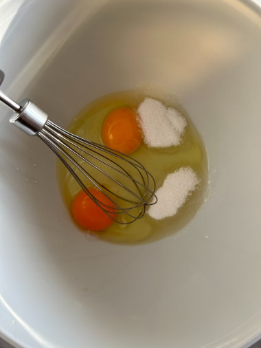 В глубокой миске соедините яйца, сахар и соль. Перемешайте все до однородности венчиком. Сильно взбивать не нужно, чтобы на поверхности не появились пузырьки. Яйца предварительно помойте с содой в теплой воде, так как на их поверхности могут находиться вредные бактерии.