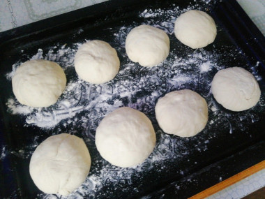 На подсыпанной мукой рабочей поверхности разделите тесто на несколько небольших кусочков, размер зависит от того, какие по размеру булочки хочется испечь. Имейте ввиду, что они значительно увеличатся в объеме после выпечки.