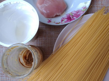 На подготовленные тарелки выложите немного готовых спагетти, а рядом добавьте куриное филе. Полейте все соусом, который образуется при приготовлении курицы.