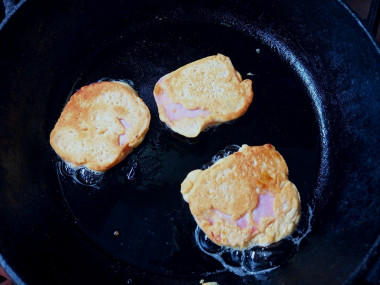 Пожарила мужу на работу ветчину в хрустящем кляре. Готовится такой кляр очень быстро, замесила его буквально за 4 минуты. Делала на одну порцию. Хватило кляра на три средних кусочка ветчины. Муки у меня ушло немного больше. Вместо одной столовой ложки две с половиной. Дополнительно добавила мускатный орех и паприку.