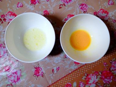 Перемешайте яйца венчиком до однородности. Сильно взбивать яйца не нужно, только чтобы соединились белок и желток. Кляр будет еще более воздушным и хрустящим, если сначала яйца разделить на белки и желтки, взбить их по отдельности, а затем соединить.