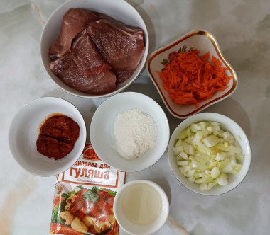 Как сделать гуляш с подливкой как в детском саду из говядины? подготовьте для этого необходимые ингредиенты. Мясо говядины выбирайте без костей.