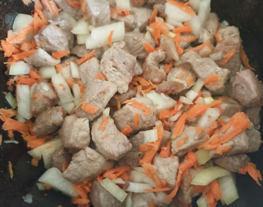 Лук и морковь добавьте в сковороду к мясу и обжарьте все вместе в течение минуты. При этом от овощей появится характерный аромат.