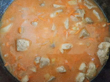Залейте получившимся соусом мясо в сковороде и доведите до кипения. По вкусу добавьте соли и специи. Накройте сковороду крышкой и тушите мясо на небольшом огне 30-40 минут. Мясо должно стать мягким.