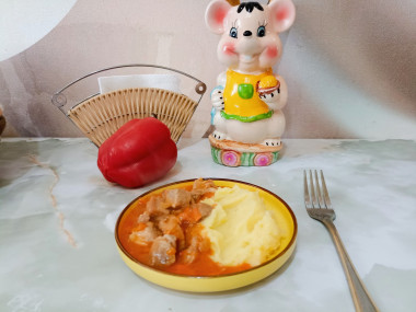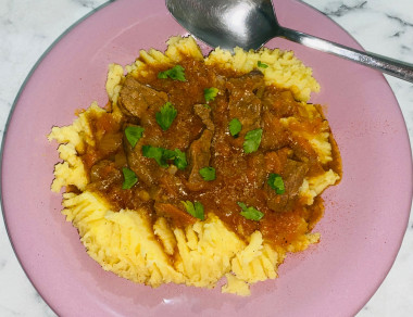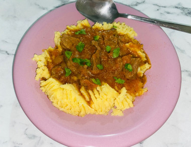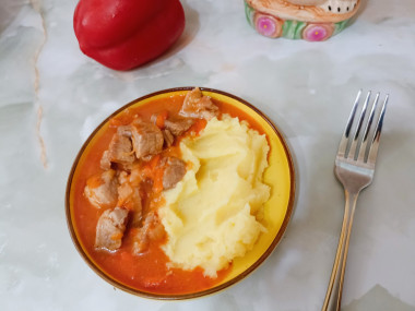 Гуляш из говядины как в детском саду получился вкусным. Нежное и мягкое мясо, овощи мягкие и почти не чувствуются, но они видны, поэтому это блюдо не для всех детей, а для взрослых само то. По совету автора на гарнир пюрешка. Отличное сочетание. Сытно.