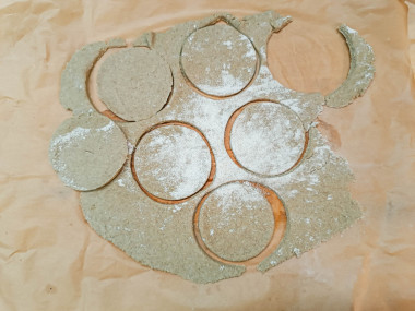 На раскатанном тесте с помощью стакана или других специальных приспособлений вырезаем кружочки. Можно также ножом порезать на квадраты, ромбы или вырезать формами для печенья разные фигурки.