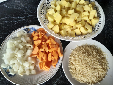 Как сварить грибной суп из лесных грибов? Подготовьте необходимые. У меня подосиновики и парочка подберёзовиков. Грибы должны быть свежие, не старые, с крепкими упругими шапочками. Овощи выбирайте среднего размера (у меня картошки не одинаковые, поэтому у меня две маленькие и одна побольше). Вермишель используйте по желанию, без неё вкус супа хуже не станет.