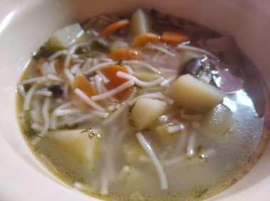Когда суп будет почти готов, добавьте в него вермишель и перемешайте. При необходимости добавьте ещё соли и выключите огонь. Закройте кастрюлю с супом крышкой и дайте ему несколько минут постоять.