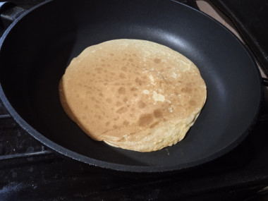 Блинную сковороду разогрейте до горячего состояния и налейте немного блинного теста. Готовьте блин в течении минуты, чтобы сверху начали появляться пузырики.