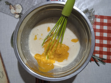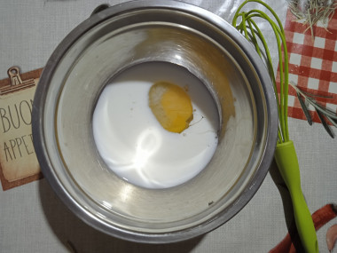 В емкости для блинного теста соедините яйцо с кефиром.