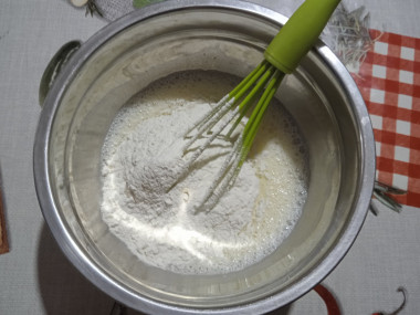 Добавьте соль, сахар, растительное масло и муку. Замесите блинное тесто.