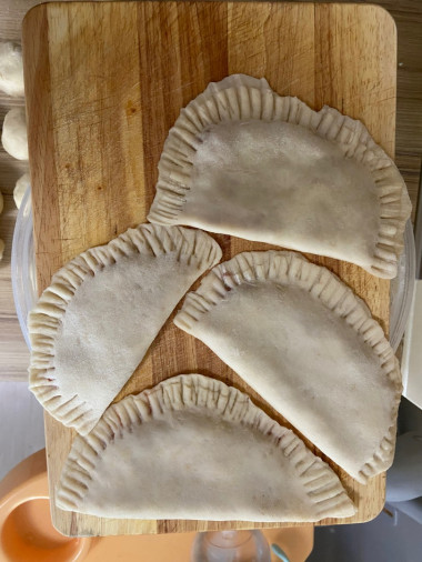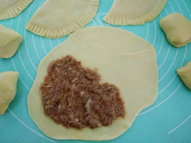 На каждую половину лепёшки выложите фарш, сверху накройте другой стороной лепёшки и защипните края. Можно просто сдавить края между собой, а можно воспользоваться вилкой, прижимая с помощью зубчиков один край к другому.