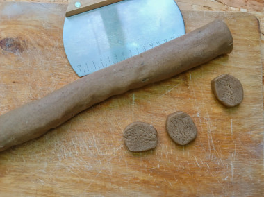 Когда тесто вылежалось час или более, включаем духовку на 180 градусов и приступаем к формовке. Тесто на ржаной муке имеет свойство растекаться, поэтому делать слишком сложные фигуры не стоит. Можно раскатать тесто в пласт и выдавить простыми формами, либо скатать из него колбаску, нарезать ножом на колечки толщиной около 8 мм и придать заготовкам округлую форму. Можно оставить пряники как есть или нанести какой-либо узор ножом.