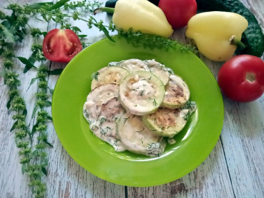 Нашла на сайте рецепт кабачок просто и вкусно. Действительно приготовить это блюдо очень просто! Заметила, что если обжаривать кабачок не посолив перед этим, то он жарится гораздо быстрее и кружочки не разваливаются. Для соуса смешала сметану, соль, укроп и два маленьких зубчика чеснока. Обжареные кабачки переложила в контейнер, залила соусом, накрыла крышкой и несколько раз встряхнула. При этом соус смешался с соком от кабачков и каждый кусочек стал покрыт им. Это очень вкусно и аромат свежего чеснока отлично сочетается с кабачками! Спасибо за рецепт!