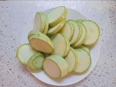 Кабачок хорошо вымойте, обязательно обсушите кухонным полотенцем. Нарежьте кабачок крупными кольцами, толщина каждого около 1 сантиметра. Укроп и петрушку так же вымойте и высушите.
