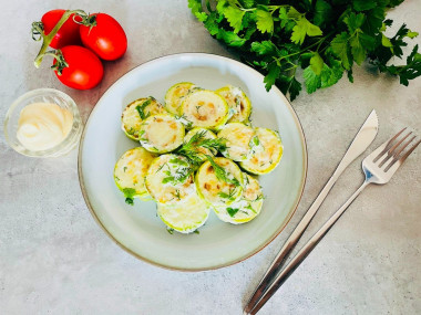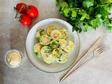 Очень легко и просто готовится, а вкус необыкновенный! Чесночок с майонезом придают кабачкам лёгкую пикантность, а зелень дополняет её, ну и красиво смотрится.