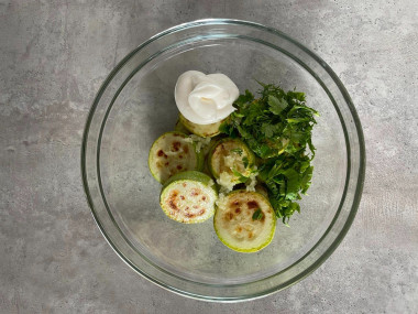 Добавьте чайную ложку майонеза, прикройте емкость крышкой и хорошо встряхните, чтобы все содержимое равномерно перемешалось. Кабачки должны быть теплыми или горячими. Кабачки выделят сок, который при встряхивании смешается с майонезом и зеленью.