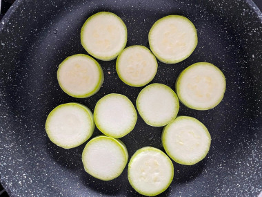 Разогрейте сковороду (лучше взять антипригарную), чуть сбрызнув ее маслом. Можно вообще обойтись без масла. Выложите кабачок в один слой. На среднем огне обжарьте одну сторону кабачков до легкой румяности. На это потребуется примерно 3 - 5 минут. Про выбор растительного масла и сковороды читайте в отдельных статьях под описанием рецепта.