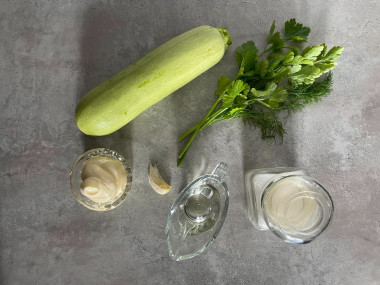 Подготовьте необходимые ингредиенты. Кабачки выбирайте молодые. У меня кабачок среднего размера. Удобнее, когда он примерно одинаковой толщины по всей длине, поэтому лучше выбирайте ровные плоды. Майонез можно заменить на сметану. О том, как приготовить домашний майонез можете прочитать в статье под описанием рецепта.