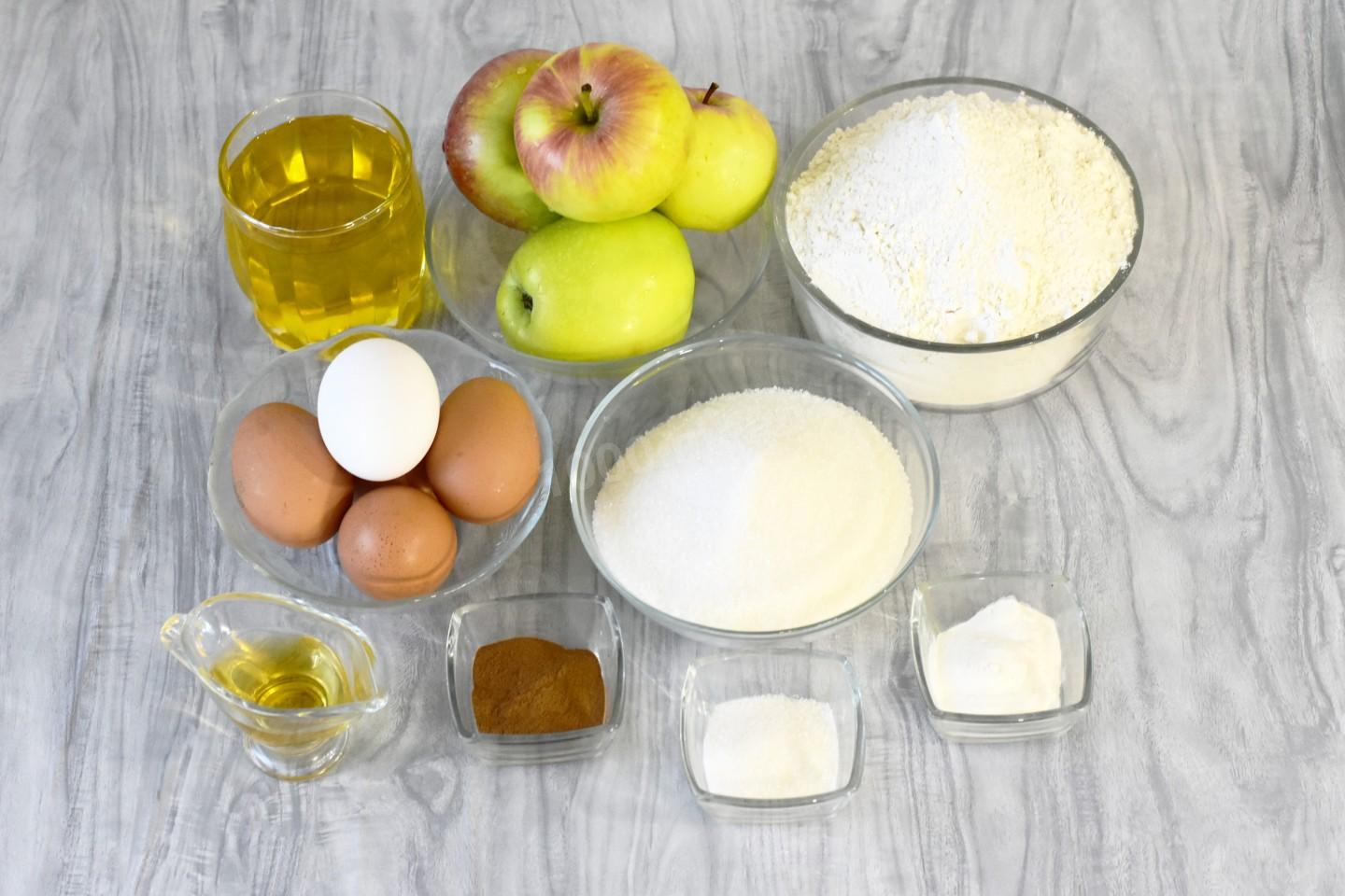 Как испечь кекс с яблоками в духовке? Вначале нужно подготовить ингредиенты. Для приготовления яблочного кекса нам понадобится: мука, сахар, йогурт (лучше яблочный, так кекс будет с более насыщенный яблочным вкусом); яйца, мягкое сливочное масло, лимонная цедра, ванилин, сода, разрыхлитель и растительное масло для смазывания формы. Кисло-сладкие яблоки.