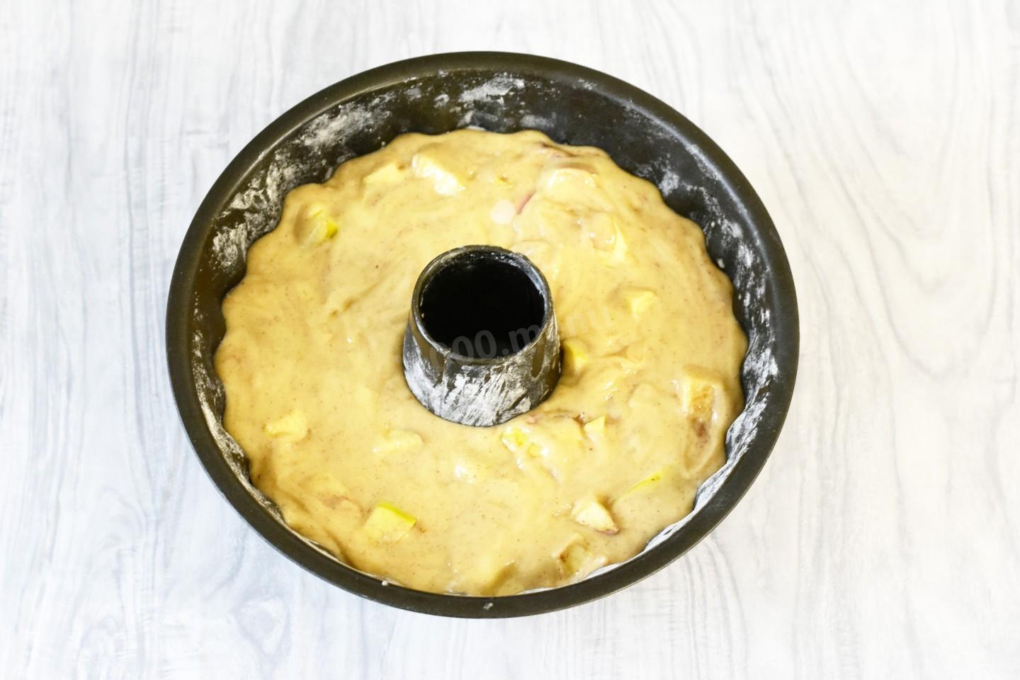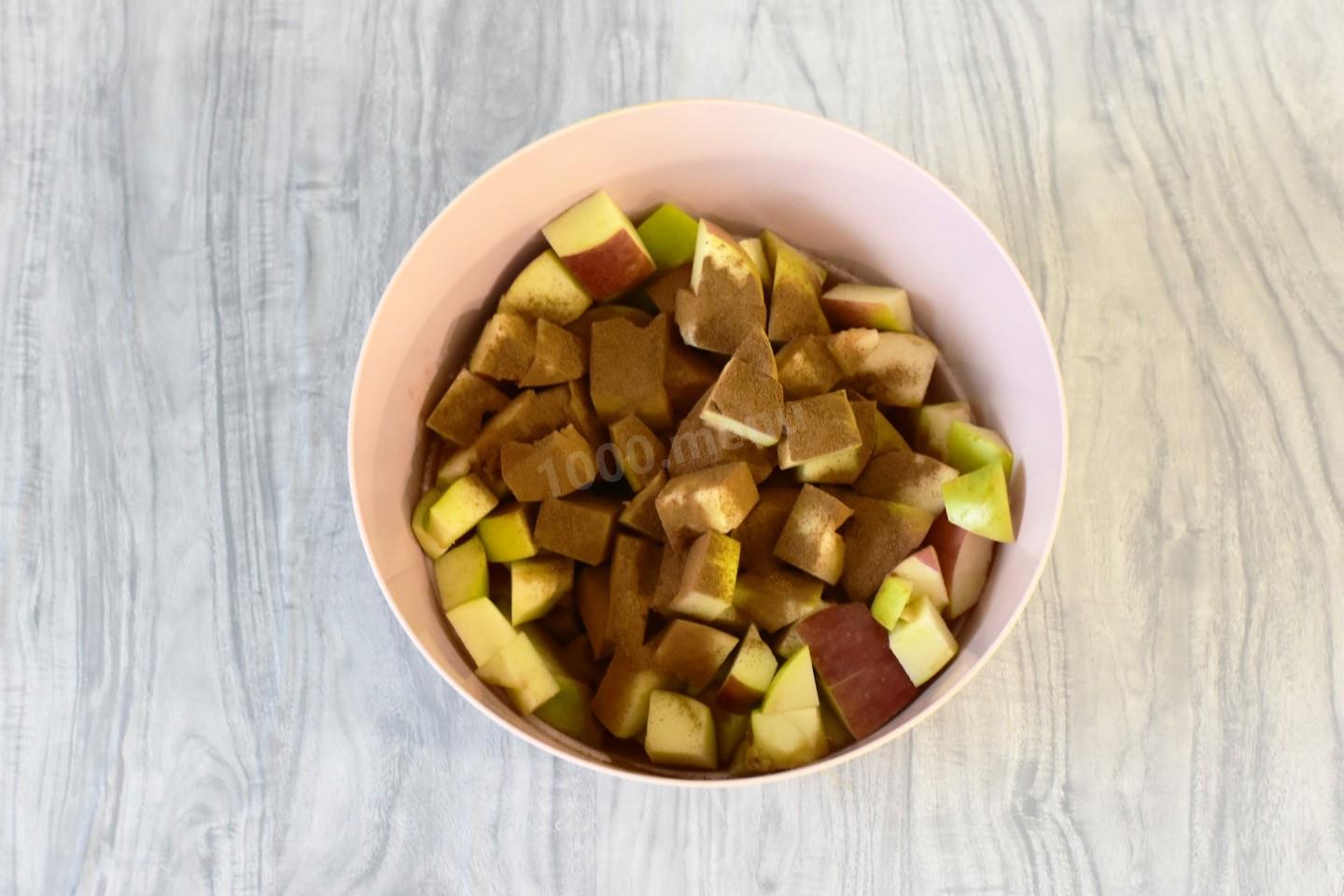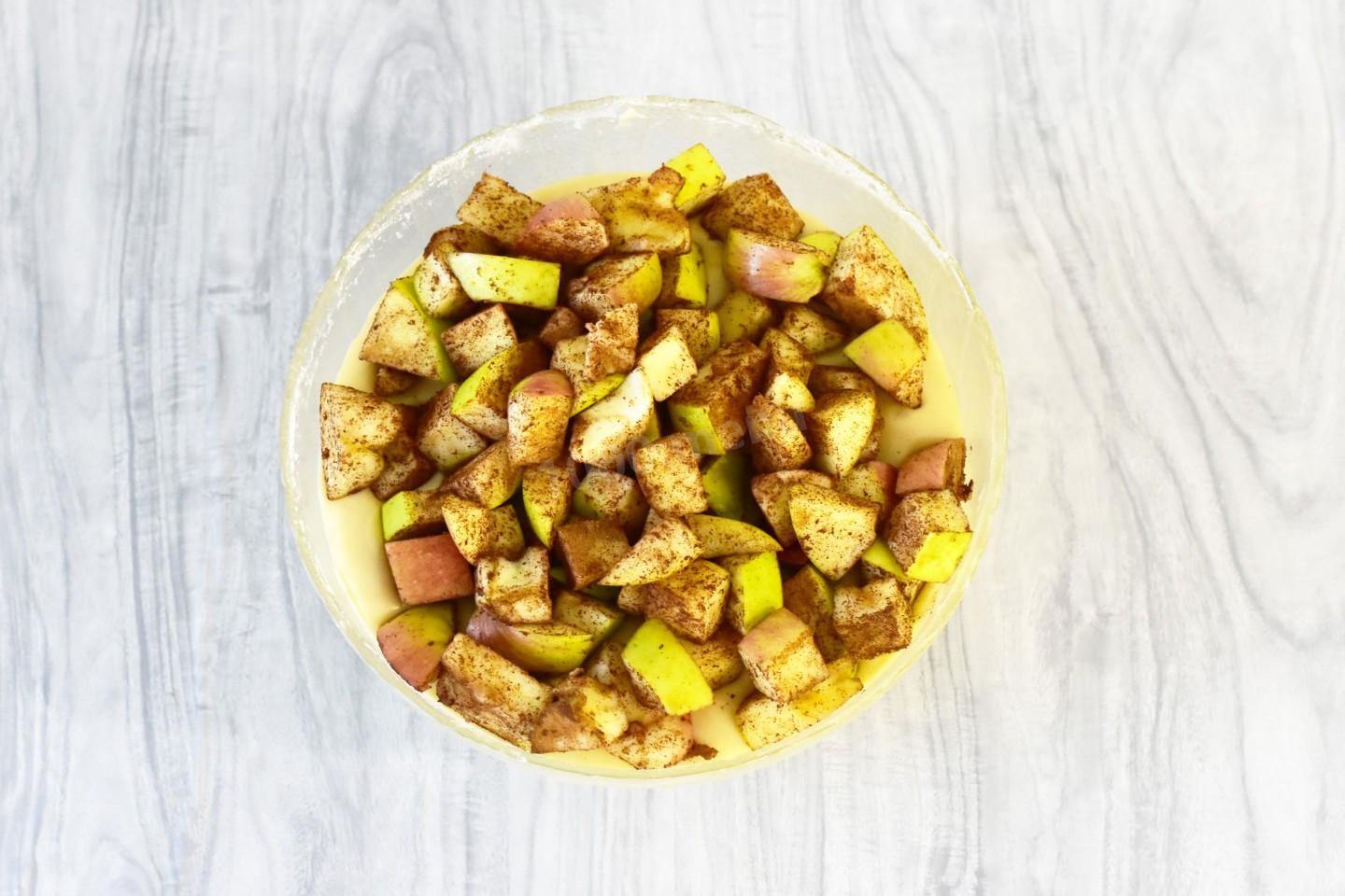 Добавить нарезанные яблоки в тесто и перемешать, чтобы фрукты равномерно разошлись по тесту.