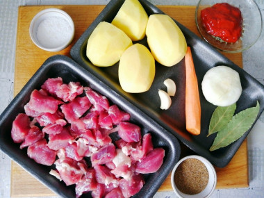 Приготовьте остальные продукты. Картофель, лук, морковь, чеснок почистите. Перец нарежьте соломкой. Лук полукольцами, а морковь кружочками. Помидор нарежьте мелкими кубиками, можно по желанию предварительно снять кожицу с томата, обдав его кипятком.