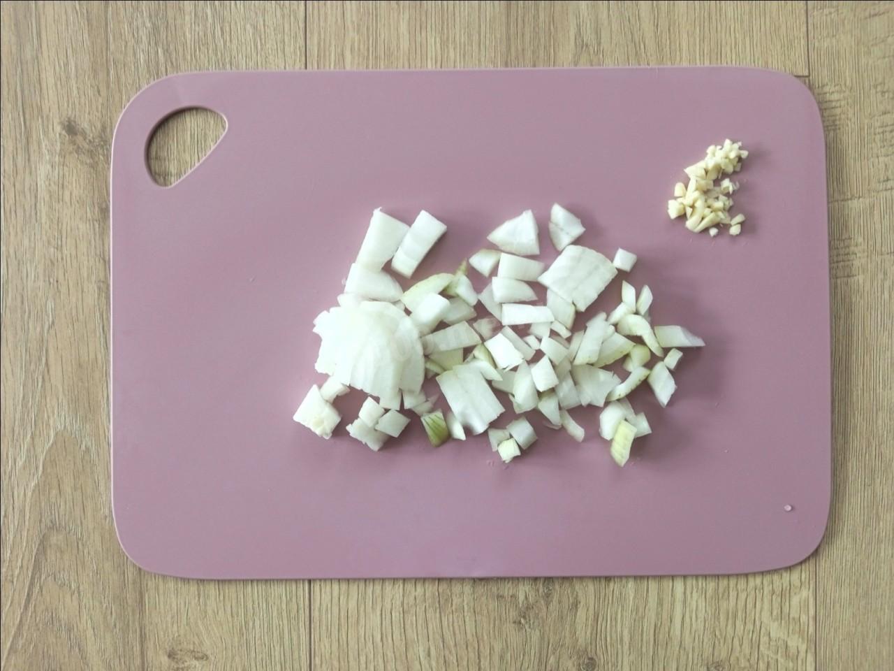 Репчатый лук и чеснок очистите от шелухи, промойте и измельчите. Лук нарежьте кубиками, а чеснок мелко порубите ножом.