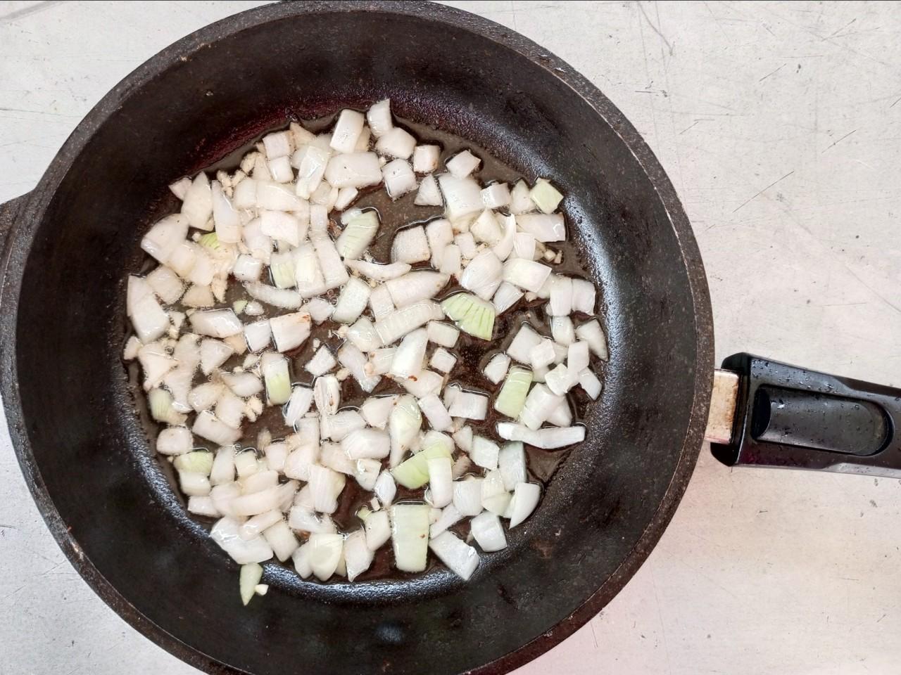 При необходимости добавьте в сковороду еще немного масла и обжарьте кубики репчатого лука и рубленный чеснок до появления характерного аромата и полупрозрачности.