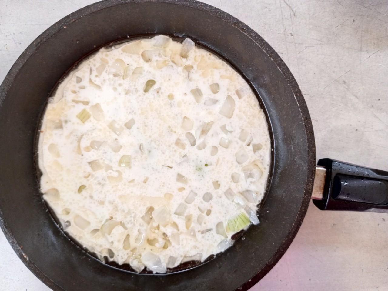 Влейте эту смесь в сковороду к обжаренным овощам.