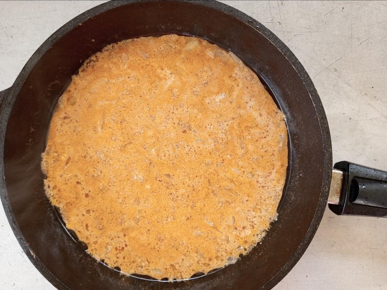 Влейте в сковороду томатный соус, добавьте соль и специи по вкусу. Хорошо перемешайте все ингредиенты. Влейте оставшуюся воду и прокипятите соус в течение примерно 2 минут на умеренном огне.