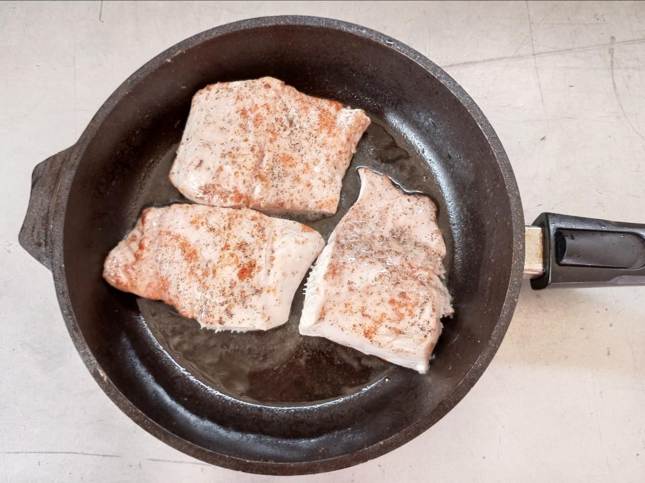 Приправьте рыбу солью, смесью молотых перцев и паприкой с обеих сторон.