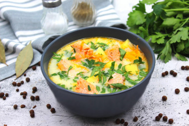 Когда картошка будет готова, положить в кастрюлю в бульон кусочки отварной форели и тертый плавленный сыр. Перемешать все ингредиенты между собой, пока сыр полностью не растворится. Добавить измельченные петрушку и укроп. Попробовать суп на вкус и в случае необходимости добавить еще немного морской соли. Снять кастрюлю с огня и оставить суп немного настояться под крышкой в течение 10 минут. Перед подачей уху можно приправить дополнительно измельченным укропом.
