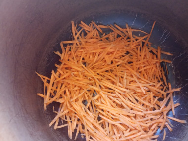 Имейте в виду, что от того, как Вы измельчите морковь, зависит и конечный результат в этом блюде: натертая морковь в процессе термической обработки превратится в кашицу и равномерно смешается с остальными ингредиентами, нарезанная соломкой или брусочками сохранит свою форму.