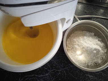 Муку просеиваем в отдельную посуду, добавляем к ней крахмал, разрыхлитель и соду. Несмотря на такое большое количество соды, ее вкус не будет чувствоваться в готовом бисквите.