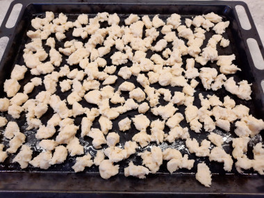 Спустя указанное время включите разогреваться духовку до 200 градусов. Теперь нужно измельчить охлаждённое тесто, чтобы запечь его маленькими кусочками. Я пропускаю тесто через мясорубку. Можно также: порезать лапшой, натереть на крупной тёрке или порвать на кусочки руками. Выложите тесто на противень, застеленный бумагой для выпечки. Поставьте противень в духовку на 20-30 минут, до румяного цвета запекаемых изделий.