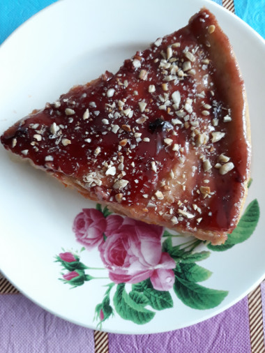 Пирог на кефире получился с отменным вкусом! Даже без добавления дрожжей тесто стало пышным и мягким. По просьбам домочадцев я заменила сахар в составе начинки на измельчённую предварительно распаренную курагу. Перед подачей на стол пирог мы украсили джемом и семенами подсолнечника.