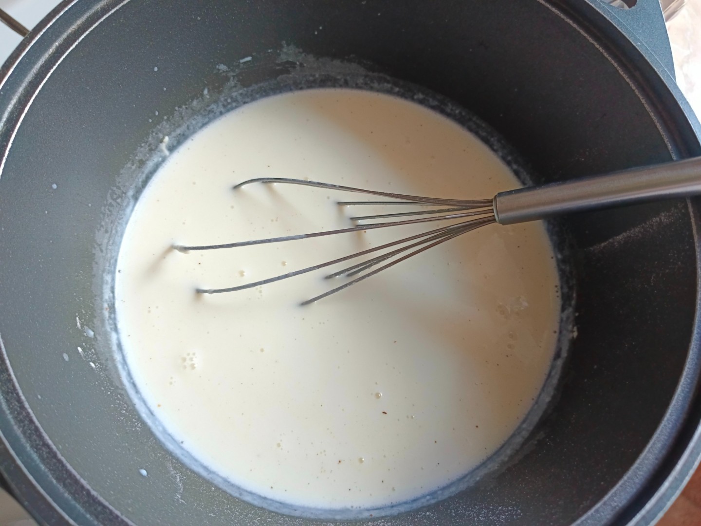 Тем временем приготовьте соус бешамель. В сотейнике с толстым дном на маленьком огне растопите сливочное масло. Добавьте муку и, при постоянном помешивании, обжарьте ее пару минут. Подогрейте молоко и частями влейте в мучную смесь, постоянно перемешивая ее (удобнее использовать венчик). На среднем огне доведите соус до кипения, приправьте солью и специями. Варите его при непрерывном помешивании 3–5 минут до легкого загустения. Затем оставьте соус остывать