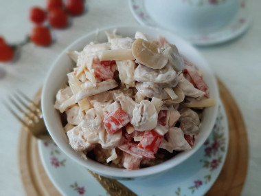 Вкусный и сытный салат Алекс с курицей и шампиньонами. Простой в исполнении рецепт из доступных продуктов очень понравился. Маринованные шампиньоны придали блюду небольшую кислинку. Соль не добавляла, а по вкусу добавила молотый черный перец. Отличное дополнение обеденного стола!