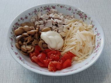 С консервированных шампиньонов слейте жидкость. Резаные, дополнительно измельчать не нужно, если грибы целые, нарежьте ломтиками и выложите в чашу к курице.