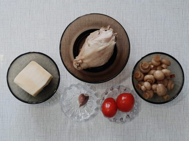 Как сделать салат Алекс с курицей и шампиньонами? Подготовьте для этого необходимые ингредиенты. Куриное филе возьмите на свой вкус отварное, запечённое или копченое. Сыр предпочтительно твёрдый или полутвёрдый, выбирайте качественный продукт. Зубчики чеснока очистите. Овощи тщательно промойте в холодной воде и просушите бумажным или кухонным полотенцем.