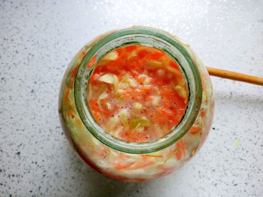 Залейте капусту остывшим рассолом так, чтобы она полностью покрыла ее — это важно, иначе капуста может засохнуть. Оставьте банку с капустой при комнатной температуре на сутки в открытом виде. В течение этого времени пару раз проткните ее длинной деревянной шпажкой или спицей до дна, чтобы выпустить образовавшийся газ. Попробуйте капусту через 24 часа — она может уже быть готова. Но моей потребовалось двое суток. Некоторые пишут, что нужно трое суток.