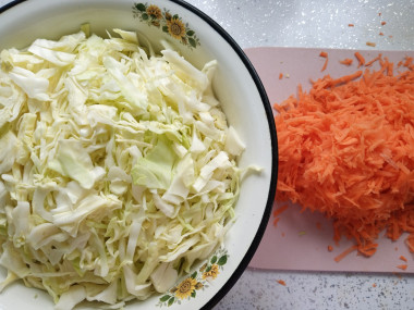 Добавьте морковь к капусте. Руками хорошо перемешайте овощи, можете даже немного помять их, чтобы капуста дала сок и стала мягче.