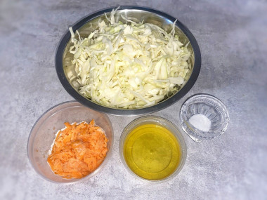 Сложите капусту в большую миску, добавьте к ней морковь, всыпьте соль. По вкусу вы можете положить кусочки кислых яблок (типа антоновки), тмин, тертый хрен.