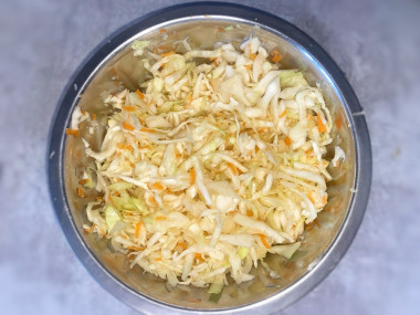 Помните капусту руками, перемешивая. Она пустит при этом сок. Но не слишком сильно, чтобы она осталась хрустящей. Заранее простерилизуйте банку, в которую будете перекладывать капусту. Как правильно это сделать читайте в конце рецепта.