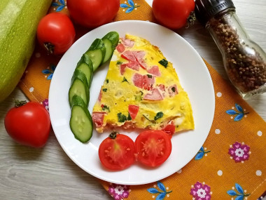 Основа блюда - яйца. Запеченные в духовке, они получаются вкусными, достаточно сытными и без лишнего жира. Начинка - овощи, отлично на эту роль подходит кабачок, он нежный и быстро готовится. Но, при желании, можно разнообразить блюдо ярким болгарским перцем, цукини, грибами, тыквой, цветной капустой или брокколи. Не стоит использовать только баклажан, он окрашивая яичную массу в некрасивый серый цвет и готовится гораздо дольше яиц.