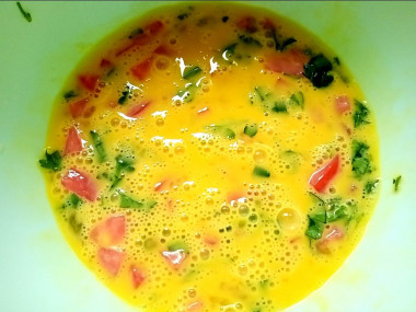 Пока кабачки тушатся, разогреваем духовку до 180 градусов. Яйца разбиваем в глубокую миску, добавляем к ним соль и зелень, немного взбиваем вилкой или венчиком до однородности. Пропаренные овощи равномерно распределяем по дну сковороды, заливаем ячной смесью и ставим в духовку.