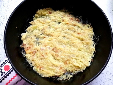 Лучше всего готовить запеканку на чугунной сковороде со съемной ручкой или вовсе без нее. Это позволит не перекладывать овощи в форму для выпекания перед перемещением их в духовку. Выкладываем в холодную сковороду кабачки и лук, ставим на огонь и начинаем медленно нагревать. Если необходимо поджарить до корочки, понадобится немного масла, но калорийность блюда увеличится. Лучше просто прогревать на среднем огне, пока овощи не выпустят сок и немного не протушатся в нем. Весь процесс займет не более 10 минут.