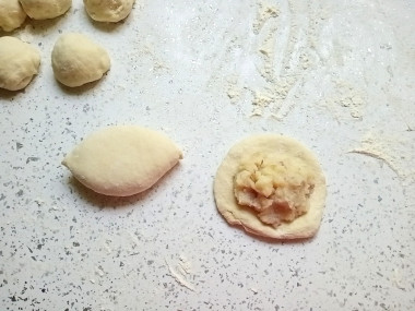 Каждый кусочек скатайте в шар и раскатайте скалкой в лепешку. В центр лепешки положите начинку и скрепите края.