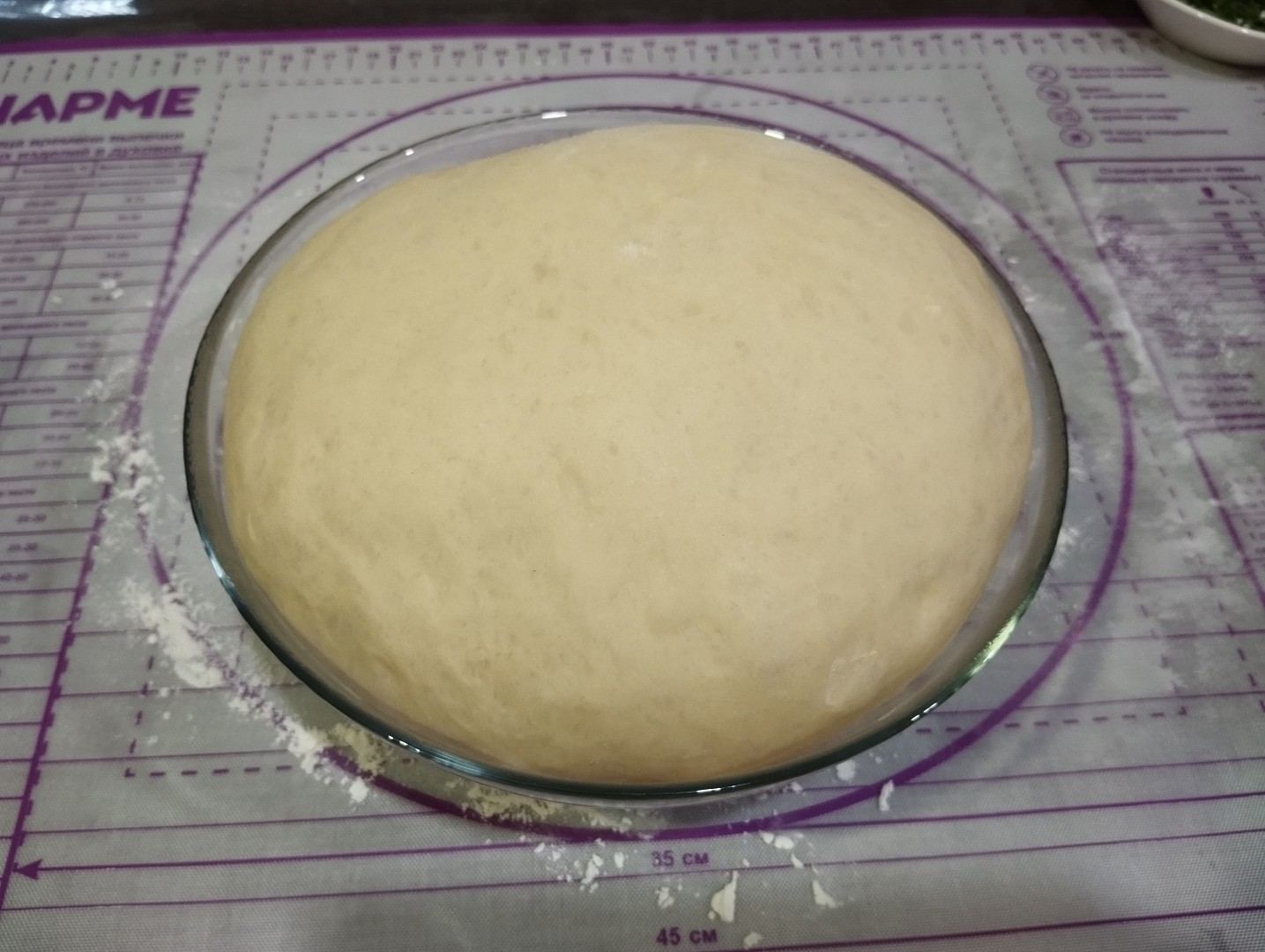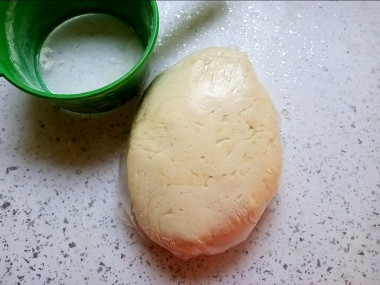 Подошедшее тесто обомните и оставьте еще на час для подъема. Готовое тесто разделите на 10 кусочков. Включите духовку на 180 градусов.